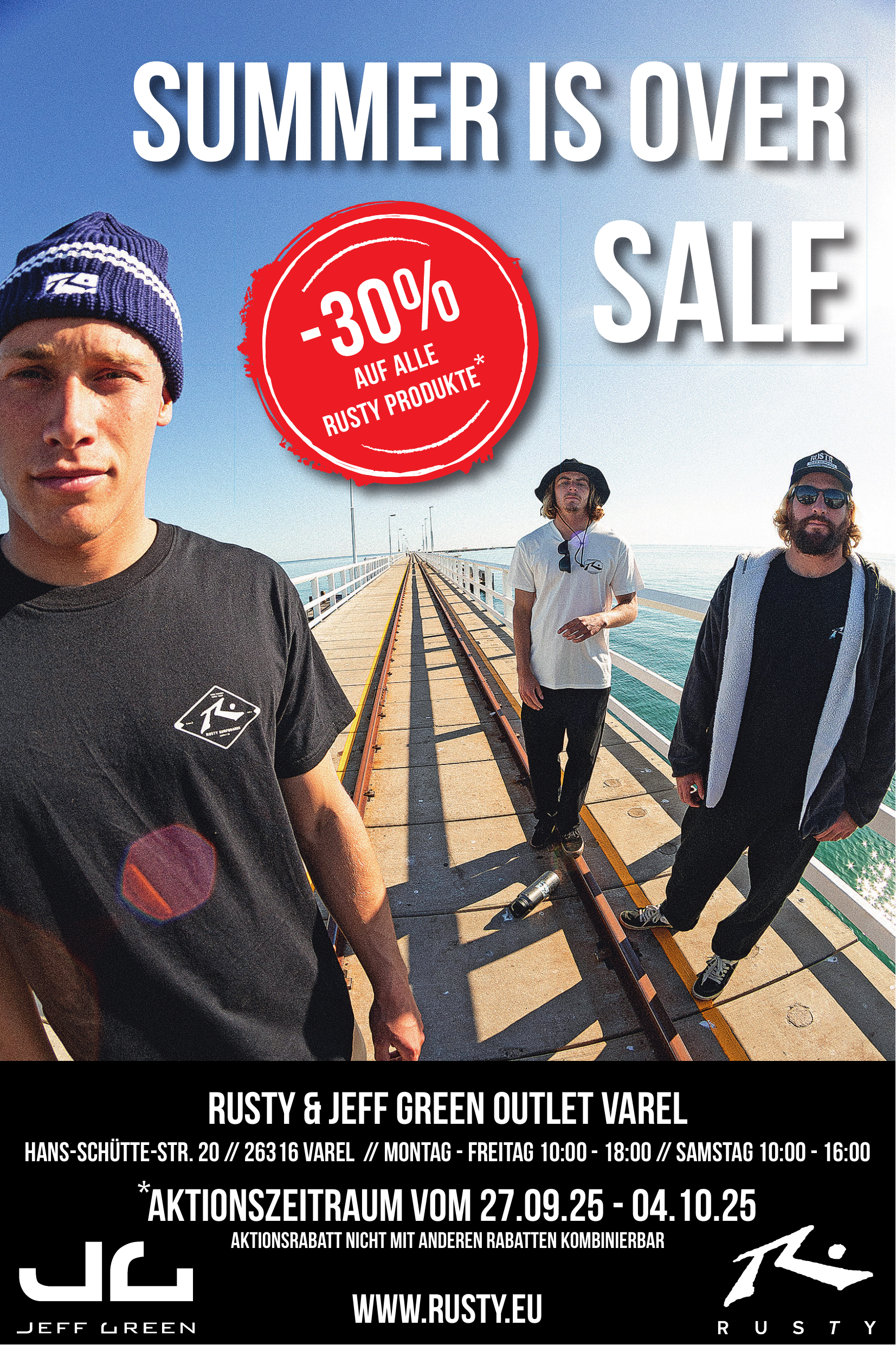 RUSTY Outlet bietet Sommer-/Frühjahrskleidung wie Boardshorts, Bikinis, Shorts, Tank Tops, T‑Shirts, Flip‑Flops, Caps und Hüte sowie Winter-/Herbstkleidung wie Jeans, Pullover, Hoodies, Cardigans, Jacken und Beanies.