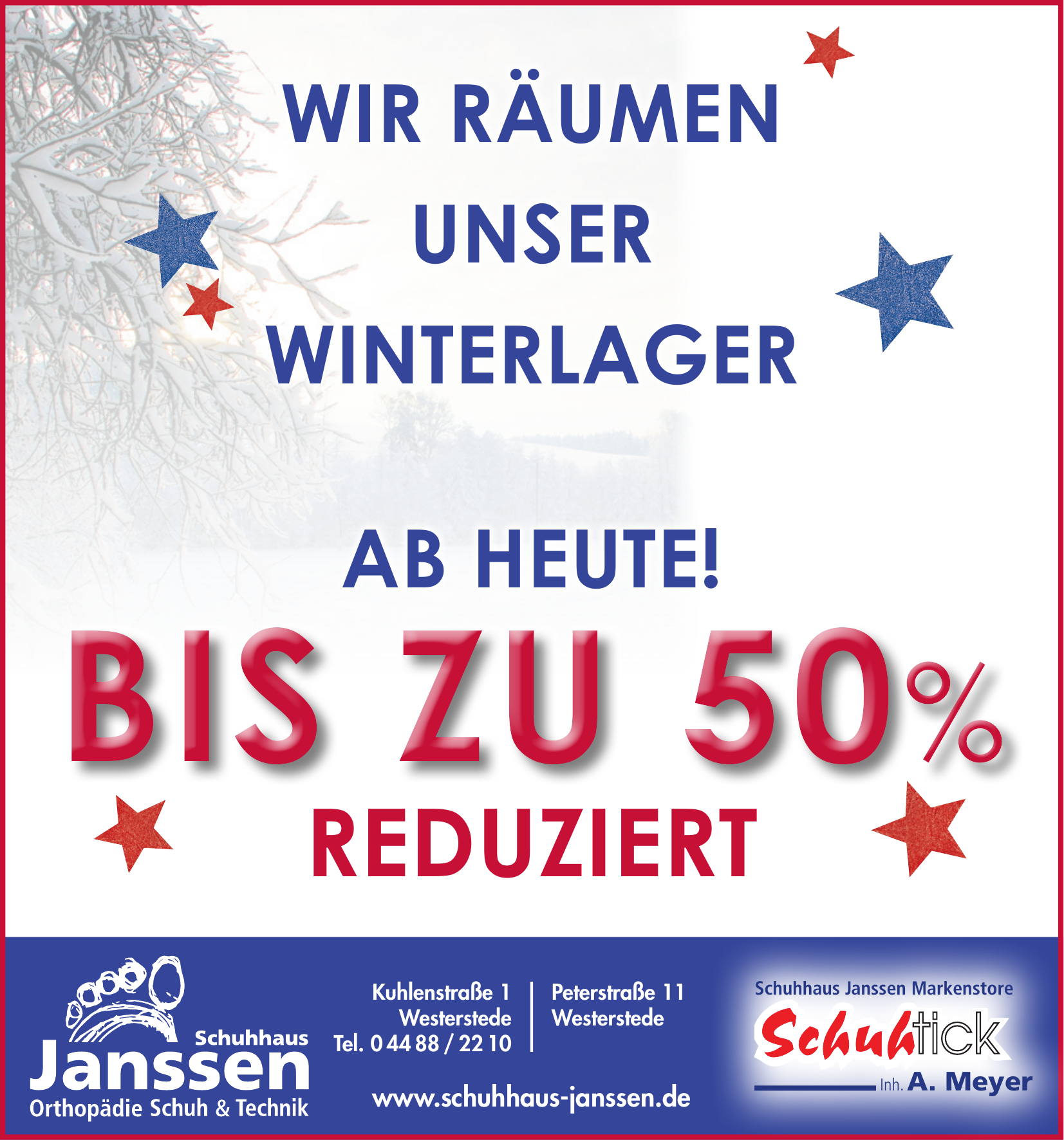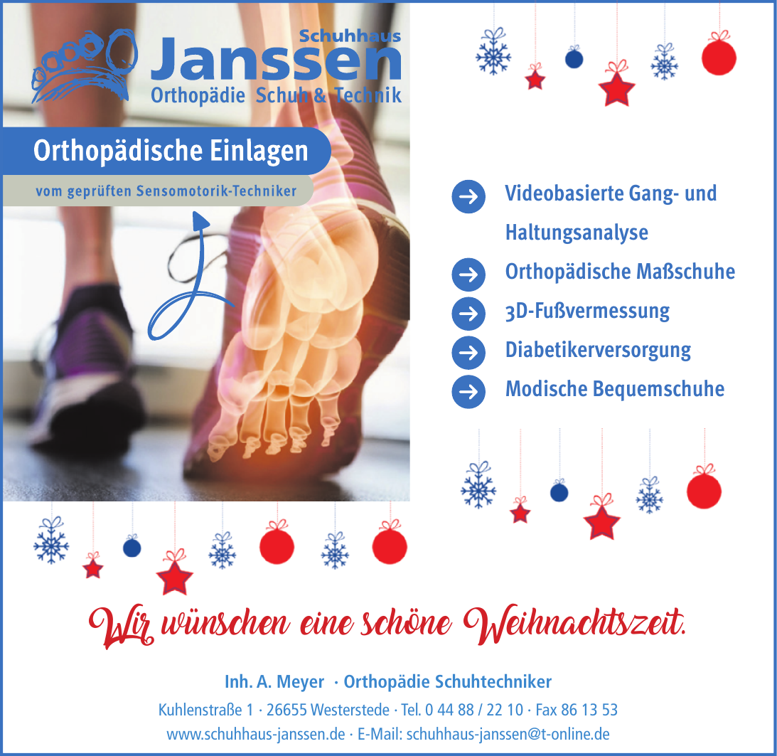 Schuhhaus Janssen - Orthopädie Schuh & Technik betreibt Standorte in Westerstede und Remels. In Westerstede finden Sie Filialen in Kuhlenstraße 1 und Peterstr. 11, sowie in Uplengen in Ostertorstraße 81 (26670).