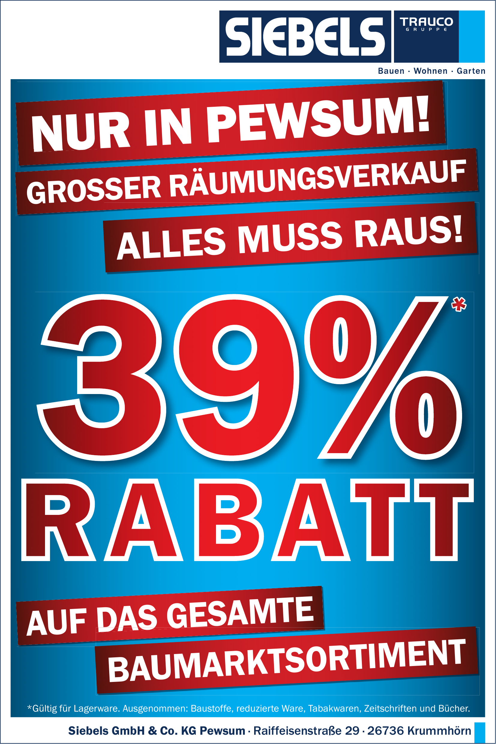Der Pewsum Baumarkt (Siebels GmbH & Co. KG Pewsum) bietet auf einer Fläche von 600 m² in Norden und 800 m² in Pewsum ein umfangreiches Sortiment an hochwertigen Baumarktprodukten. Dazu gehören Maschinen, der Weber Premium Shop, Eisenwaren, Gartenmöbel, Elektro, Farben und Gartenzubehör. Das Unternehmen ist Weber Premium Händler; Weber-Grills gehören zur großen Grill-Ausstellung (neben BBQ Torro und Petromax). Im Sortiment finden Sie zudem namhafte Hersteller wie Makita, und vier Mitarbeiter beraten Sie pers