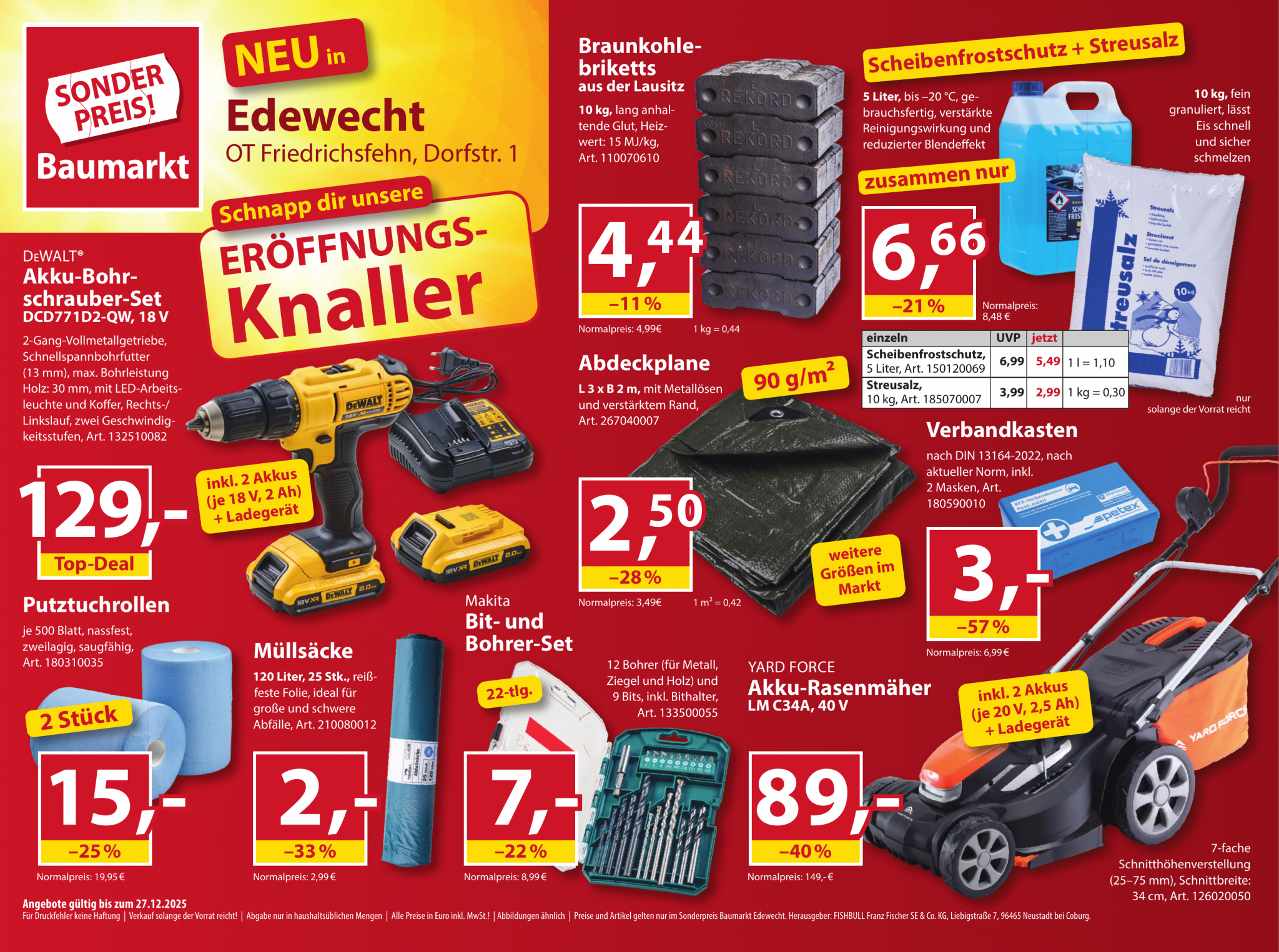 Für Druckfehler keine Haftung | Verkauf solange der Vorrat reicht! | Abgabe nur in haushaltsüblichen Mengen | Alle Preise in Euro inkl. MwSt.! | Abbildungen ähnlich | Preise und Artikel gelten nur im Sonderpreis Baumarkt Edewecht. Herausgeber: FISHBULL Franz Fischer SE & Co. KG, Liebigstraße 7, 96465 Neustadt bei Coburg.