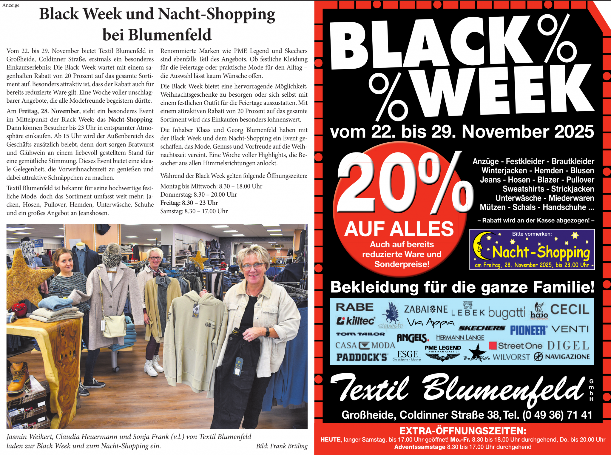 Für einen Besuch in der Brautabteilung wird empfohlen, einen Termin zu vereinbaren. Kontaktieren Sie das Geschäft telefonisch unter 04936 7141 oder per E-Mail.
