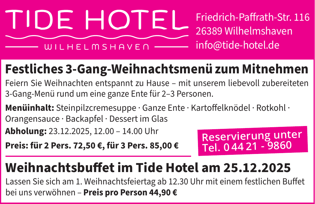 Das Tide Hotel befindet sich in der Friedrich-Paffrath-Straße 116, 26389 Wilhelmshaven. Sie können uns telefonisch unter +49 4421 986-0 kontaktieren.