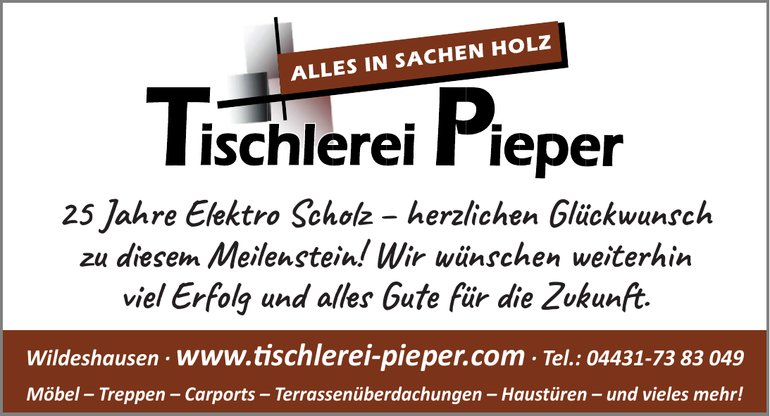 Tischlerei Pieper wird als Familienunternehmen beschrieben, das mit freundlichen Mitarbeitern und einem Azubi-Team arbeitet. Das Unternehmen betont hohe Qualität beim Material und bei der Fertigung, bietet auch Sonderlösungen und ist in ehrenamtlicher Arbeit, z. B. bei der Kinderfeuerwehr, engagiert.