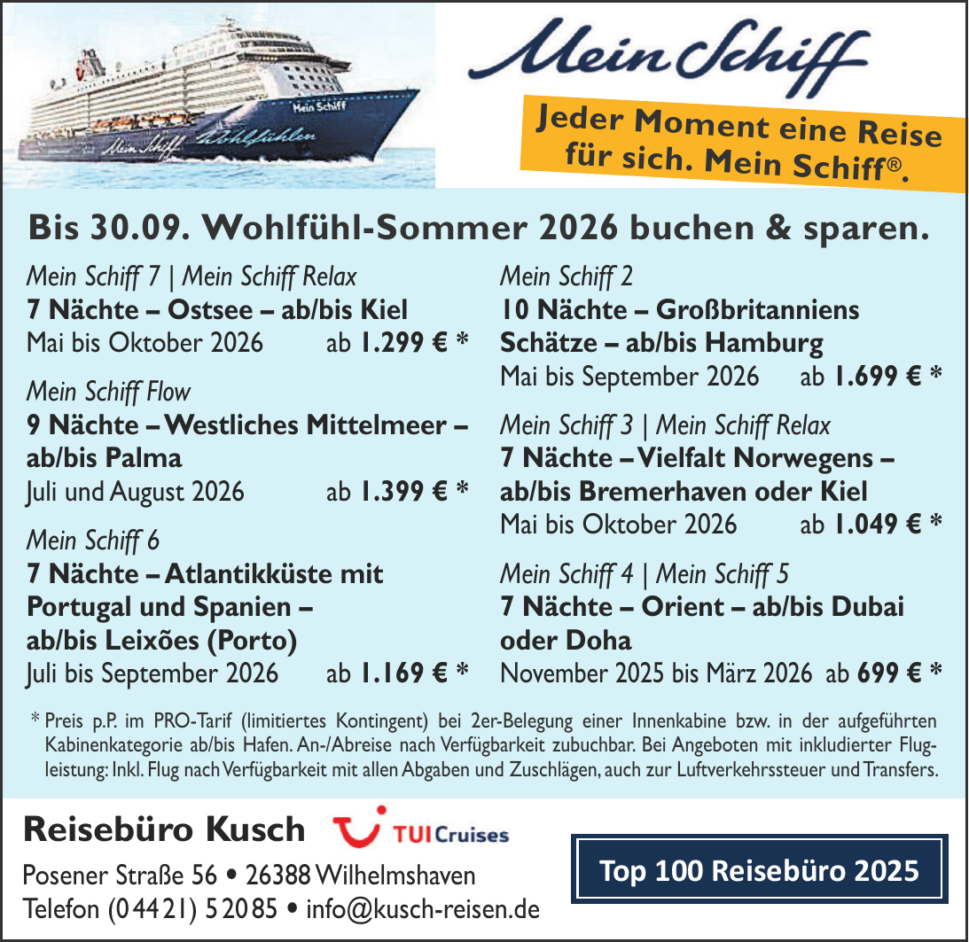 Das Touristik Reisebüro Kusch in Wilhelmshaven bietet eine Vielzahl von Reisen an, darunter Last-Minute-Trips, Fernreisen, Kurzurlaube, Familienurlaube, Pauschalreisen, individuell geplante Reisen und Kreuzfahrten.