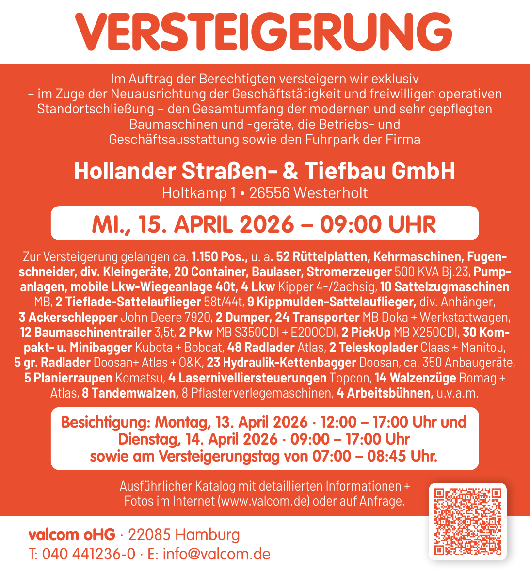 Im Auftrag der Berechtigten versteigern wir exklusiv - im Zuge der Neuausrichtung der Geschäftstätigkeit und freiwilligen operativen Standortschließung - den Gesamtumfang der modernen und sehr gepflegten Baumaschinen und -geräte, die Betriebs- und Geschäftsausstattung sowie den Fuhrpark der Firma