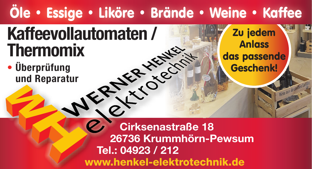Sie können Werner Henkel Elektrotechnik telefonisch unter 04923 212 erreichen oder eine E-Mail an info@henkel-elektrotechnik.de senden. Die Adresse lautet Cirksenastraße 18, 26736 Krummhörn.