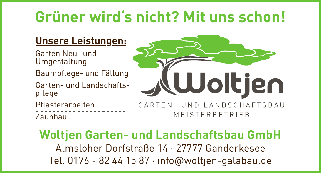 Die Landschaftsgärtnerei Woltjen überzeugt durch langjährige Erfahrung und höchste Qualitätsstandards. Zu den Schwerpunkten zählen die kreative Gartenplanung, regelmäßige Pflegearbeiten sowie spezialisierte Dienstleistungen rund um den Baum – von der Baumpflege über den Rückschnitt bis zur Fällung. Moderne Techniken wie Hubarbeitsbühnen, Bagger und Seilklettertechnik kommen dabei zum Einsatz. Besonderes Augenmerk liegt auf nachhaltigen, bienenfreundlichen Bepflanzungskonzepten, die gemeinsam mit den Kundinnen und Kunden entwickelt werden.
