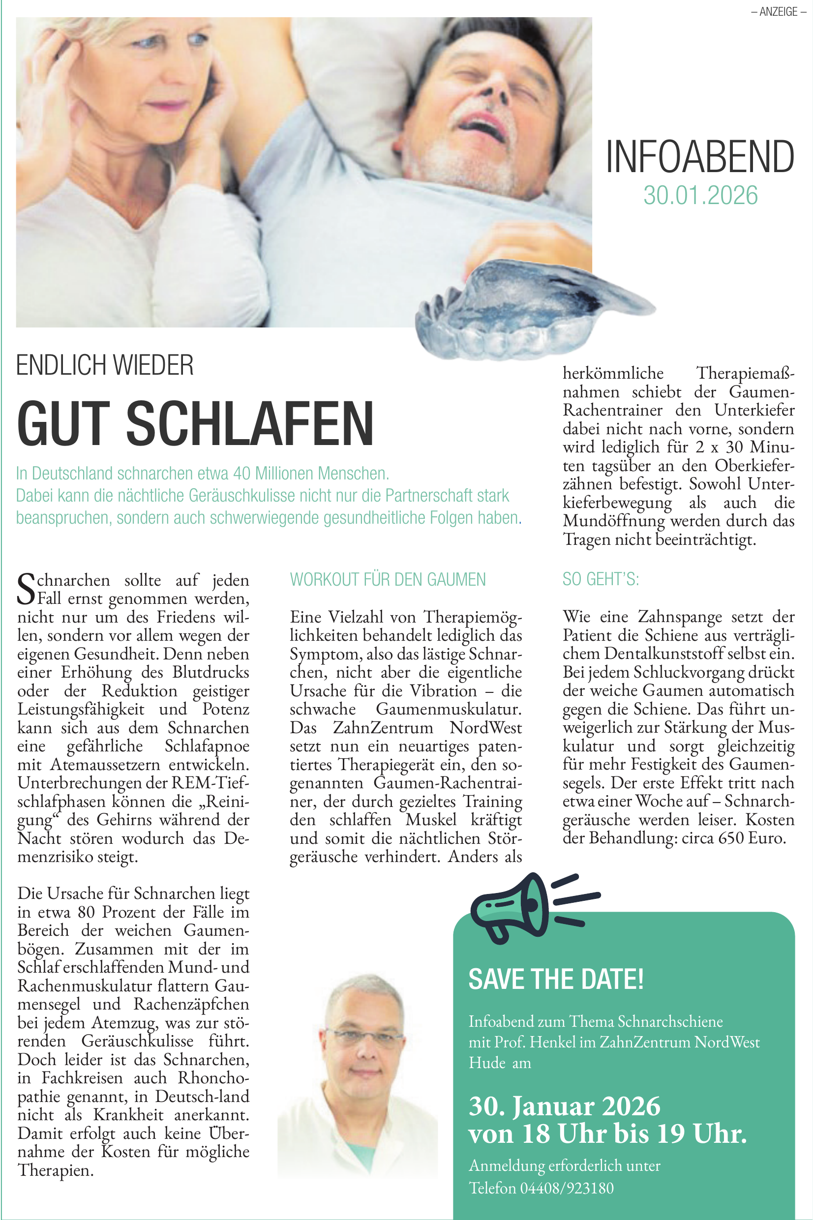 Eine Vielzahl von Therapiemöglichkeiten behandelt lediglich das Symptom, also das lästige Schnarchen, nicht aber die eigentliche Ursache für die Vibration - die schwache Das Gaumenmuskulatur. ZahnZentrum NordWest setzt nun ein neuartiges patentiertes Therapiegerät ein, den so- genannten Gaumen-Rachentrainer, der durch gezieltes Training den schlaffen Muskel kräftigt und somit die nächtlichen Störgeräusche verhindert. Anders als herkömmliche Therapiemaß- nahmen schiebt der Gaumen- Rachentrainer den Unterkiefer dabei nicht nach vorne, sondern wird lediglich für 2 x 30 Minuten tagsüber an den Oberkieferzähnen befestigt. Sowohl Unterkieferbewegung als auch die Mundöffnung werden durch das Tragen nicht beeinträchtigt.