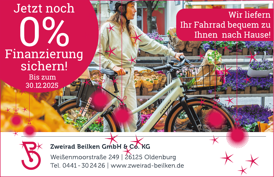 Zweirad Beilken in Oldenburg bietet eine große Auswahl an Fahrrädern, darunter Cityräder, Trekkingräder, Mountainbikes, Crossräder, Rennräder, Hollandräder, Kinder- und Jugendräder, Lastenräder, Urban-Bikes und Fahrrad-Anhänger. Es führt Marken wie Cube, Riese und Müller, Gazelle, Stevens, Bulls, Pegasus, Victoria, Ridley, Puky, Conway, QiO, Bakfiets, Ortlieb, Endura, Ergon, und SQlab.
